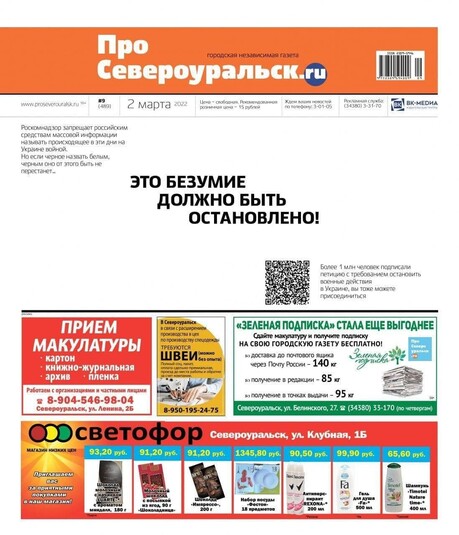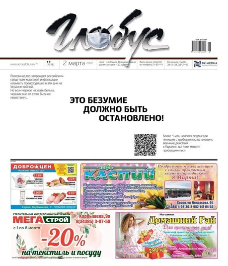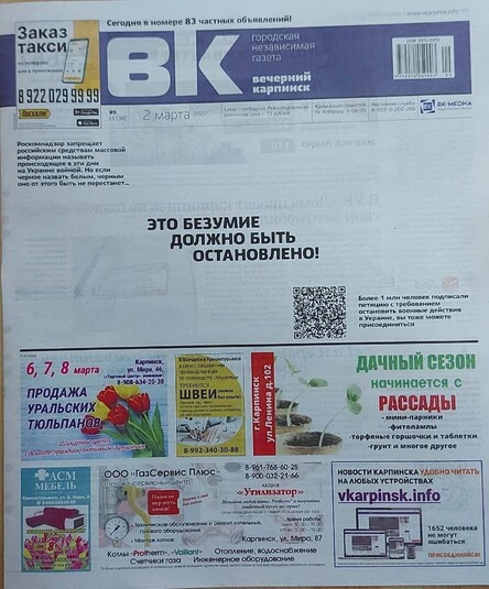 Газети північних міст Свердловської області країни-агресорки сьогодні вийшли з обкладинками проти війни в Україні. На передових газетах «Вечірній Краснотур'їнськ», «Вечірній Карпінськ», «Про Північноуральськ» та «Глобус» (місто Сєров) надруковано фразу «Це божевілля має бути зупинено».