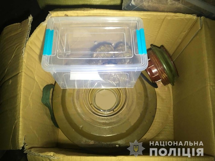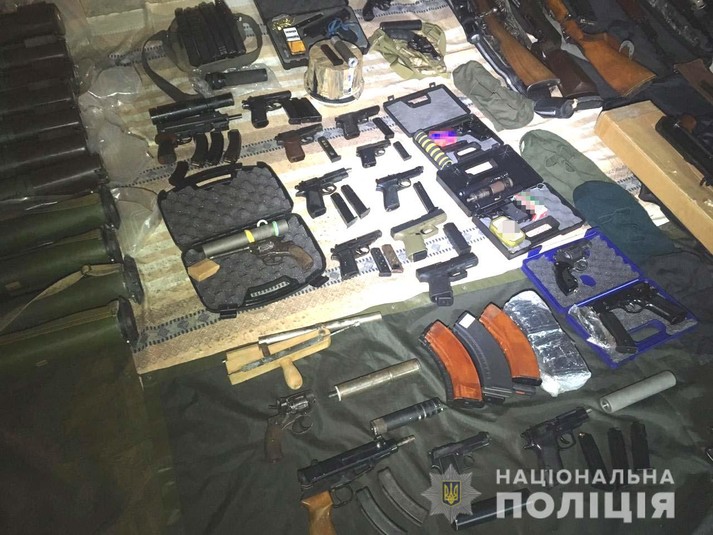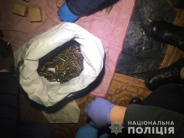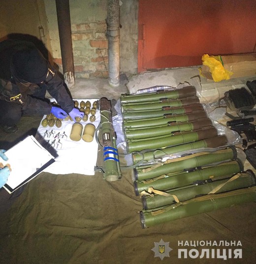 Там виявили 70 корпусів гранат і запалів до них, 27 електродетонаторів, 6 тротилових шашок, 4,5 кг тротилу, 2 кг пластиду, один саморобний радіокерований вибуховий пристрій, 11 РПГ, 28 ВОГ, один підствольний гранатомет, 16 пістолетів, 5 револьверів, 4 пістолета-кулемета, 8 автоматів Калашникова, 5 гвинтівок, одна СВД, одна гладкоствольну рушницю і більше 10 тисяч патронів різних калібрів. Під час обшуків у квартирі підозрюваного поліцейські вилучили патрони. Крім того, правоохоронці знайшли і чорнові записи із зазначенням прізвищ осіб, щодо яких вчинялися або планувалися злочини.