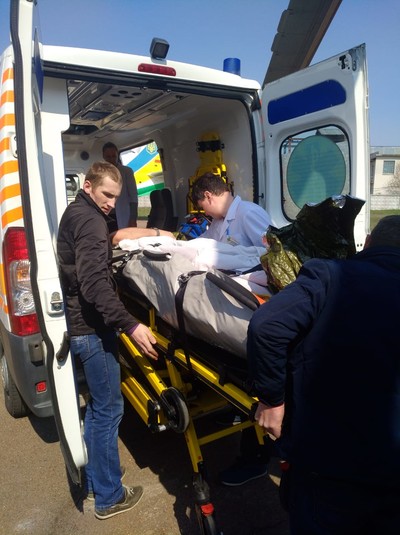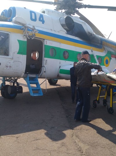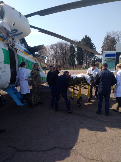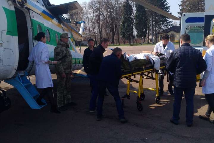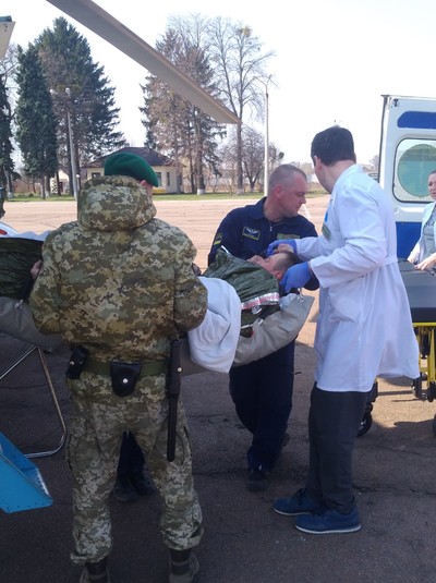 Пораненого на КПВВ «Мар'їнка» прикордонника вертольотом доставили в Головний військово-медичний клінічний центр Держприкордонслужби в Києві.