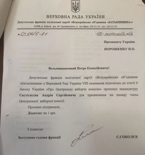 Як відомо, президент Порошенко передав голові Верховної Ради подання на оновлення складу ЦВК: він запропонував 14 кандидатів від різних політичних сил у парламенті, але кандидатури «Батьківщини» в переліку не було.