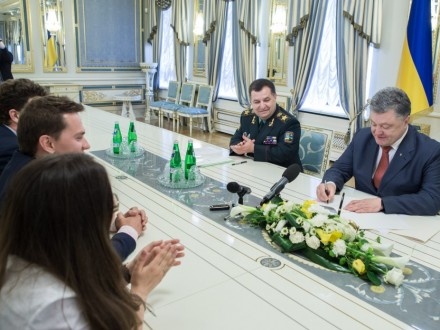 Підписання закону відбулося під час зустрічі Президента з представниками Волонтерського десанту Міністерства оборони, зокрема Тетяною Домановою, Артуром Переверзєвим, Павлом Кирієнком, Анастасією Ковальовою та Вадимом Малородом.У зустрічі також узяли участь міністр оборони України генерал армії Степан Полторак та заступник глави Адміністрації Президента України Андрій Таранов.