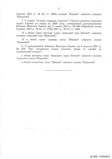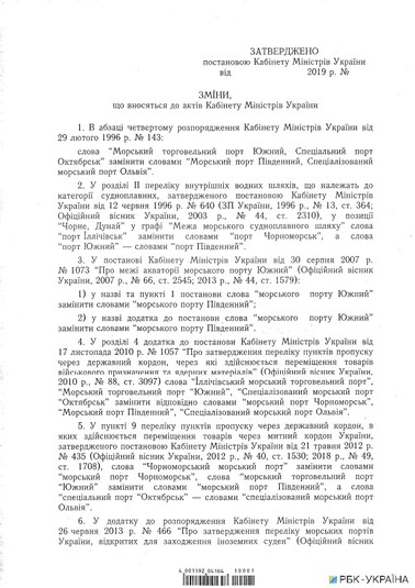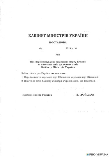 Сьогоднішнім рішенням внесли зміни до деяких нормативно-правових актів, в результаті чого морський торговельний порт «Южний» буде називатися морський порт «Південний», «Іллічівський морський торговельний порт» став морським портом «Чорноморськ», а спеціалізований порт «Октябрськ» змінив назву на «Ольвію».