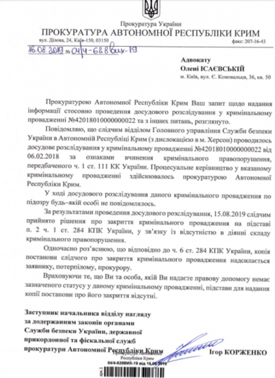 Прокуратура АРК зокрема повідомила адвокату Портнова, що 15 серпня кримінальне провадження за ознаками вчинення кримінального правопорушення за ч.1 ст.111 Кримінального кодексу (державна зрада) закрито у зв'язку з відсутністю в діянні складу кримінального злочину.