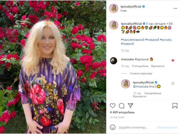 Відома українська співачка Таїсія Повалій, яка нещодавно жила і будувала кар'єру в Росії, повернулася в Україну. У своєму Instagram артистка поділилася новим фото і поскаржилася на спеку в Києві.