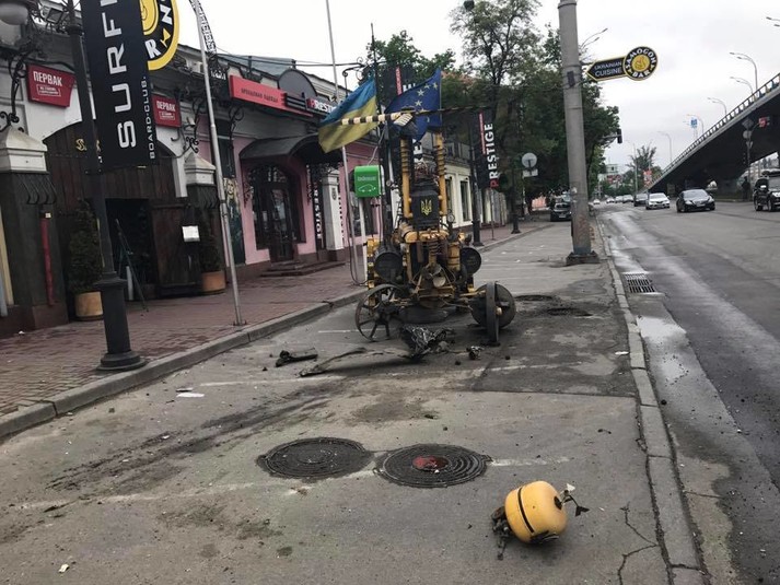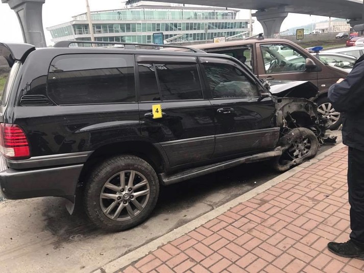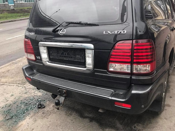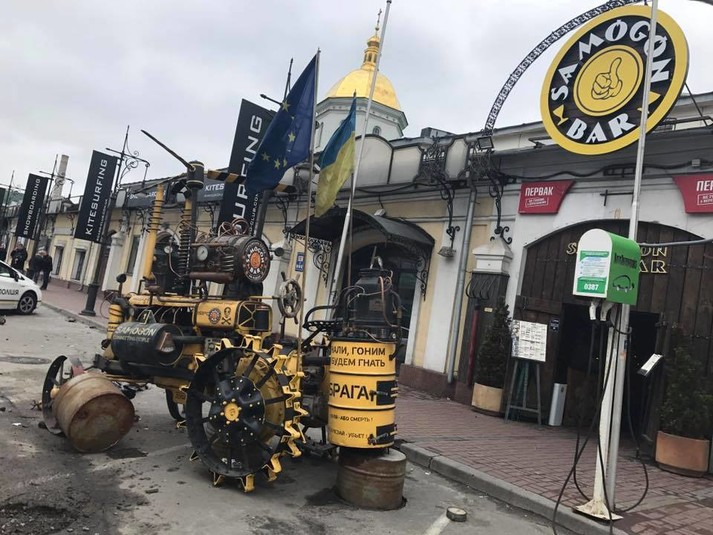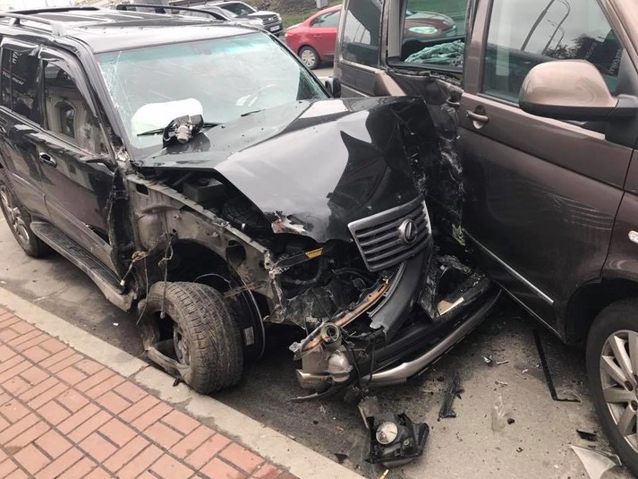 «За даними відеокамер посольства, на Подолі джип Лексус держномер АА9777ВЕ зробив епічну аварію: вилетівши на тротуар, зніс пам'ятник з довоєнним трактором навпроти ресторану «Самогон» і врізався через 60 метрів в мікроавтобус», - йдеться в повідомленні.