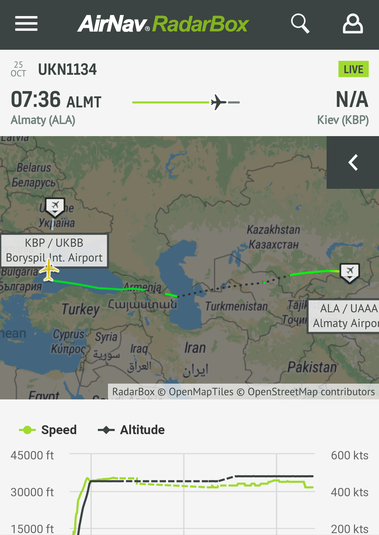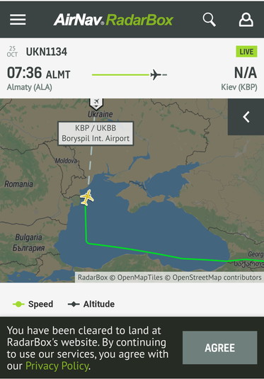 Літак Зеленського здійснив посадку а Алмати для дозаправки і вже зараз, пролетівши над Чорним морем, увійшов у повітряний простір України. Про це свідчать дані сервісу «Радарбокс», який відслідковує трекінг літаків.