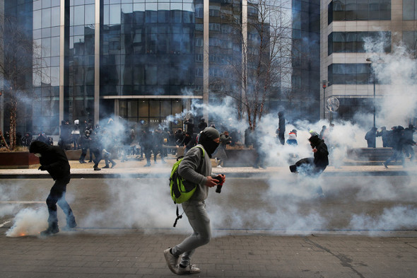 Демонстранти почали кидати пляшки та петарди у будівлю. Поліцейські застосовують водомети та сльозогінний газ, спецназ намагається оточити та відтіснити протестувальників далі від центру так званого Європейського кварталу.