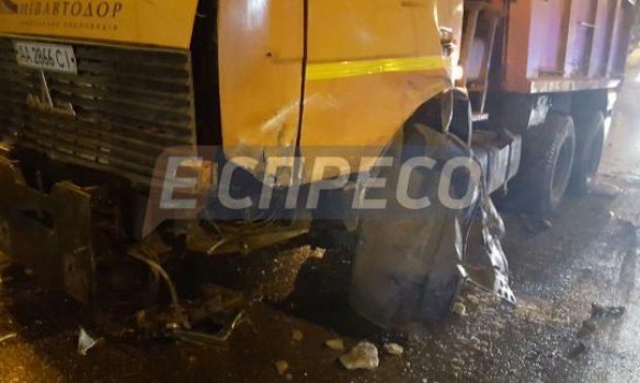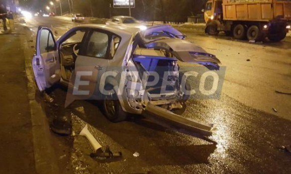 У Києві на Повітрофлотському проспекті вночі сталася масштабна ДТП. Водій автомобіля Daewoo Lanos на високій швидкості врізався в автомобіля Renault, який рухався в попутному напрямку. Автомобіль від удару вилетів на зустрічну смугу, де зіткнувся з вантажівкою комунальних служб, який перевозив близько 20 тон снігу, пише «Еспрессо».