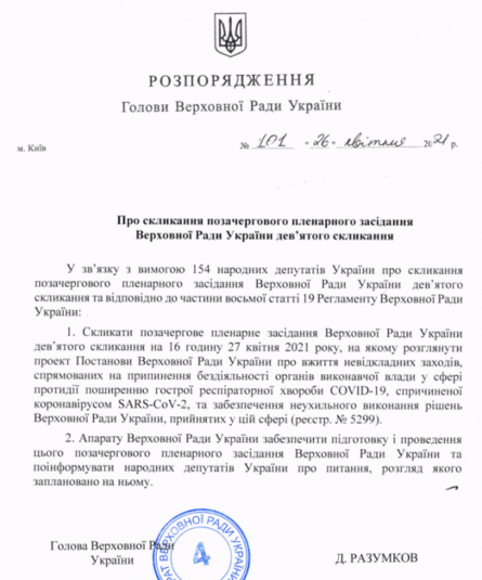 «У зв’язку з вимогою 154 народних депутатів України про скликання позачергового пленарного засідання Верховної Ради України дев’ятого скликання та відповідно до частини восьмої статті 19 регламенту Верховної Ради України скликати позачергове пленарне засідання Верховної Ради України дев’ятого скликання на 16 годину 27 квітня 2021 року, на якому розглянути проєкт Постанови Верховної Ради України про вжиття невідкладних заходів, спрямованих на припинення бездіяльності органів виконавчої влади у сфері протидії поширенню гострої респіраторної хвороби Сovid-19, спричиненої коронавірусом SARS-CoV-2, та забезпечення неухильного виконання рішень Верховної Ради України, прийнятих у цій сфері (реєстр. № 5299)», – ідеться у розпорядженні №101.