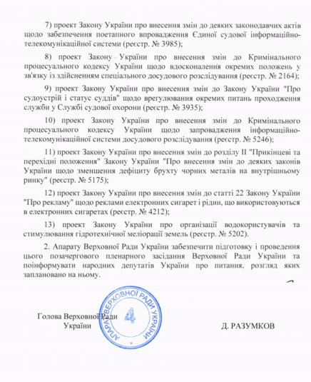 Крім того, у зв’язку з вимогою 153 народних депутатів про скликання позачергового пленарного засідання Ради дев’ятого скликання та відповідно до частини 8 статті 19 регламенту Верховної Ради скликається друге позачергове пленарне засідання одразу після завершення першого позачергового пленарного засідання, ідеться у розпорядженні №102.