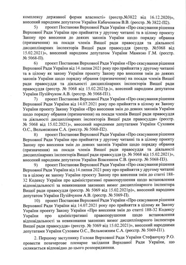 У порядку денному – розгляд 10-ти проєктів постанов щодо скасування рішень Верховної Ради про ухвалення законів, які стосуються реформи судочинства (законопроекти №3711-д, №5068, №5069) та трансформації «Укроборонпрому» (№3822).