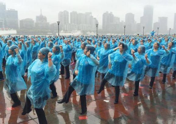 Танець тривав п'ять хвилин і сорок секунд. З погодою пощастило не всім: в Шанхаї жінкам довелося танцювати під дощем.