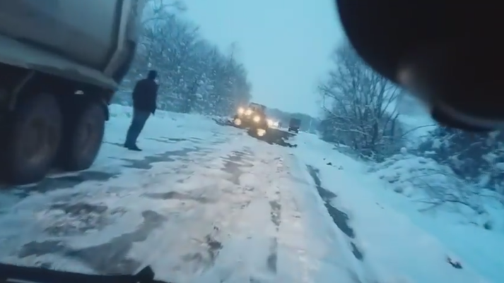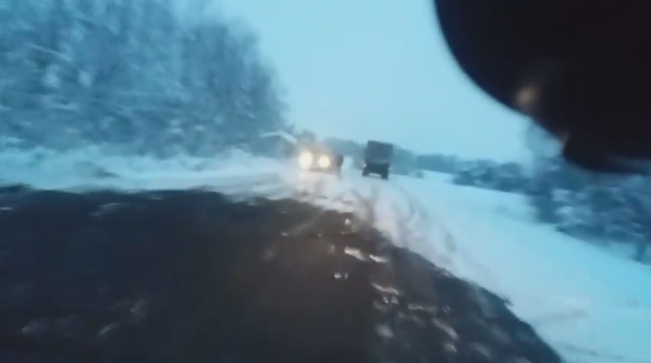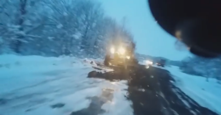 На відео видно, що дорожні служби підсипають трасу якоюсь сумішшю, причому це робиться не зважаючи на погодні умови – мороз та шар снігу з льодом на трасі.