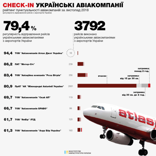 Протягом листопада 2018 року з аеропортів нашої країни українські авіакомпанії здійснили 3 792 авіарейси, іноземні — 2 514.