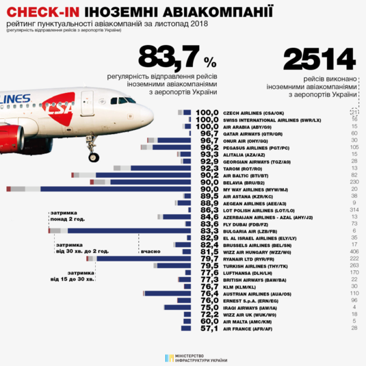 Міністерство також оприлюднило рейтинг регулярності відправлення рейсів іноземними компаніями з аеропортів України. Зокрема, три авіакомпанії виконали 100 % рейсів вчасно. Це — CZECH AIRLINES, SWISS INTERNATIONAL AIRLINES, AIR ARABIA.
