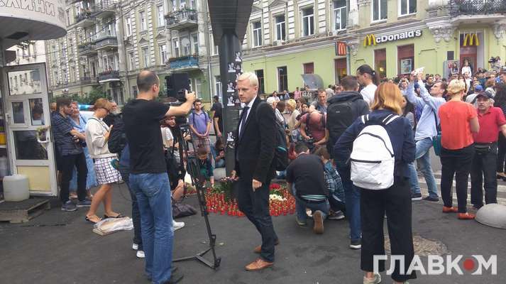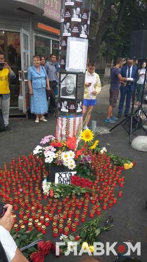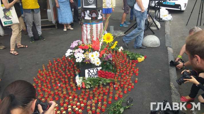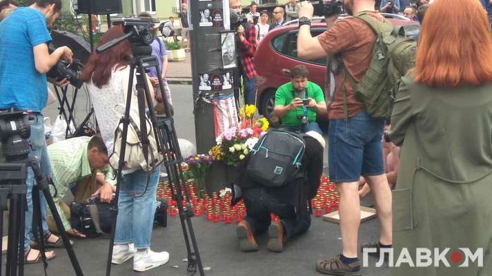 Станом на цей час, тут зібралося близько сотні людей. Серед них є деякі політики, зокрема народні депутаи Світлана Заліщук та Мустафа Найєм. Люди несуть до місця вбивства журналіста квіти і запалюють свічки.