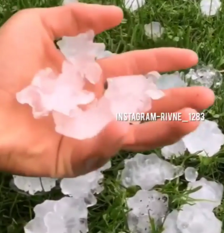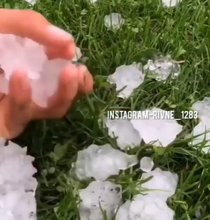 Так, у селі Млинок Вараського району випав гігантський град. Місцеві жителі показали величезні на траві.