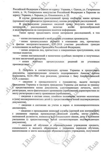 У запиті РФ просить повідомити про розслідування «фактів перешкоджання участі російських громадян» в Києві, Львові, Одесі та Харкові та надати копії матеріалів. Також росіяни попросили надати інформацію та документи Авакова, зокрема, дані про громадянство та видачу паспорта України, дані про склад сім'ї, освіту тощо.
