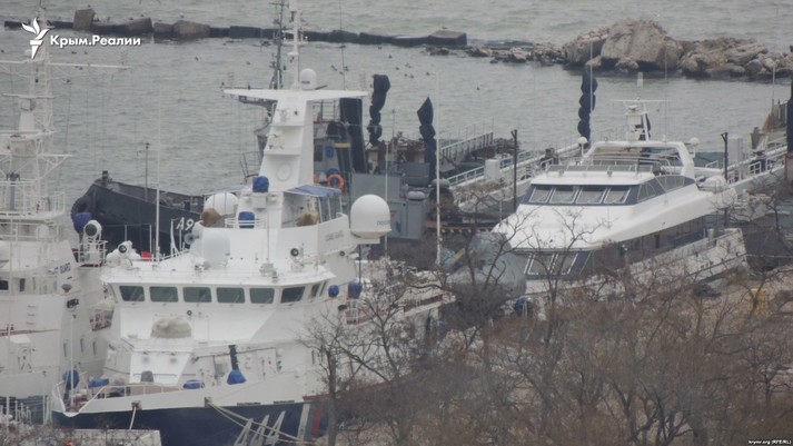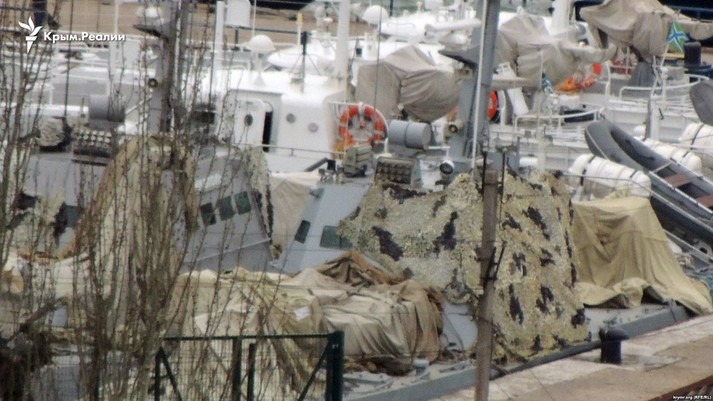 Як повідомляє кореспондент видання, українські катери перемістили ближче до берега, їх накрили маскувальною сіткою і закрили з боку моря російськими військовими катерами.
