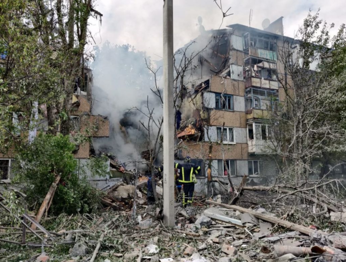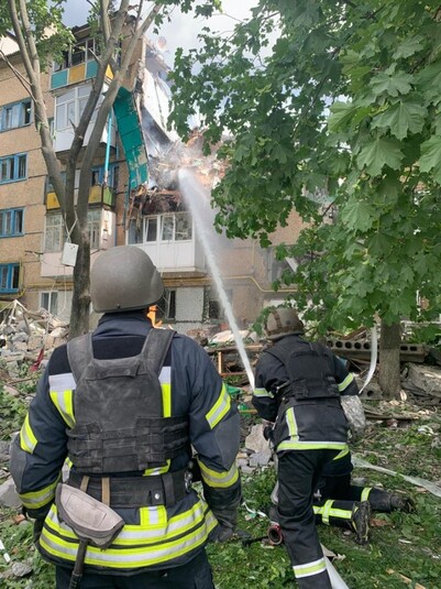 «17 травня о 13:30 у м. Бахмут внаслідок ракетного обстрілу сталося влучання у п’ятиповерховий житловий будинок, внаслідок чого в другому під’їзді відбувся обвал конструктивних елементів будинку з п’ятого по перший поверхи з послідуючим загоранням.