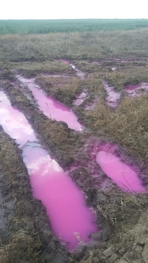 Рожеві калюжі на полі біля Рівного можуть бути наслідком розливу агрохімікатів. На місці працюють фахівці. Про це повідомляє Державна екологічна інспекція.