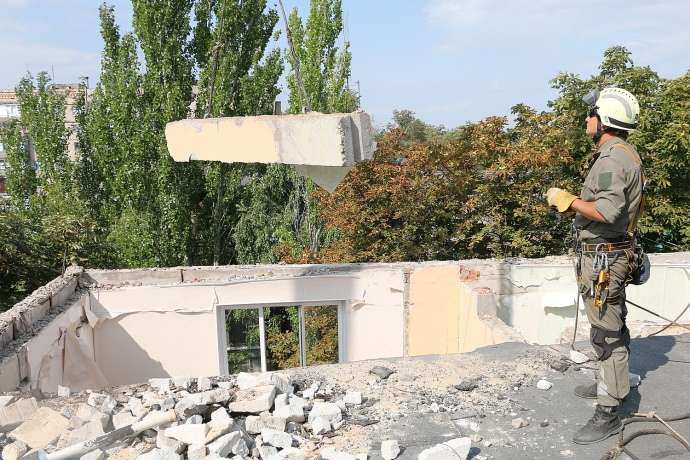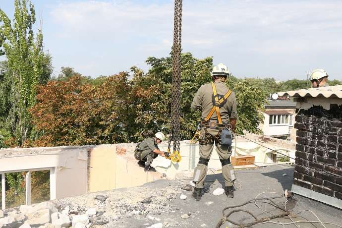 Із 5 серпня за цією адресою демонтовано вже 63 елементи будівельних конструкцій та їхніх уламків (близько 107,7 т), розкрито 85 кв. м руберойду з утеплювачем, знято цегляну кладку даху довжиною 18 м (висотою 0,4 метри), демонтовано 5 кв. м цегляної кладки, очищено від будівельного сміття 48 м стиків між залізобетонними плитами, очищено від будівельного сміття покрівлю п’ятиповерхового будинку, прорізано руберойд в місцях стиків пліт загальною довжиною 24 м, прибрано 3,7 т. залишків будівельних матеріалів на 4 поверсі.
