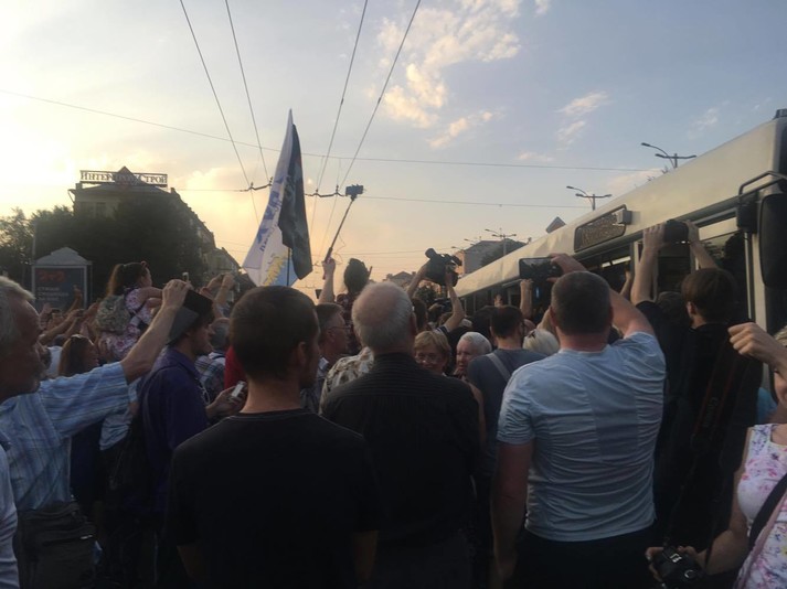 Відзначимо, що в ході дійства на центральному проспекті утворився затор, а поліцейські змушені були в терміновому порядку оточити територію, щоб не пустити присутніх на проїжджу частину.