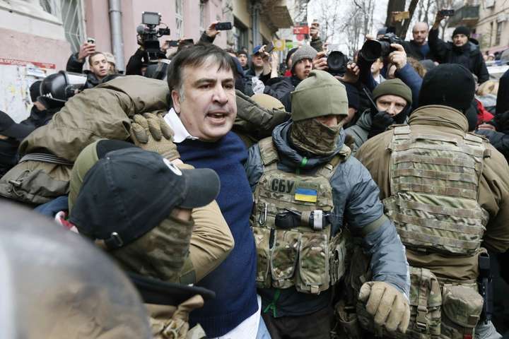 Наразі екс-голова Одеської ОДА Михайло Саакашвілі вийшов з автомобіля на вулиці Трьохсвятительській у Києві, до якого його посадили після затримання. Активісти зламали двері у мікроавтобусі та звільнили Саакашвілі. Перед цим активісти розбили вікна у мікроавтобусі, в якому везли Саакашвілі. Авто вдалося проїхати близько 10 м назад, після чого мітингувальники почали бити вікна з його лівої сторони. Правоохоронці застосували сльозогінний газ із балончиків, після цього автобус проїхав ще близько метра вверх заднім ходом.