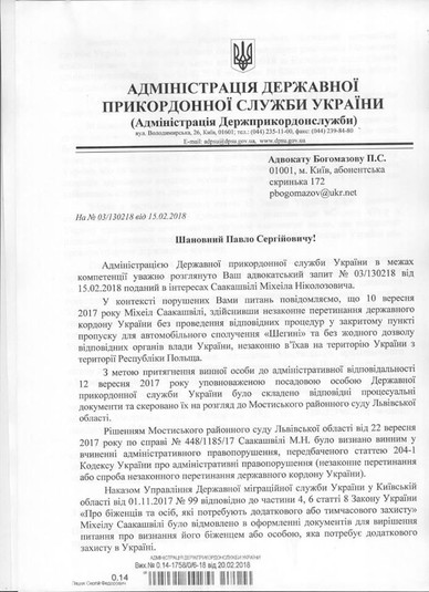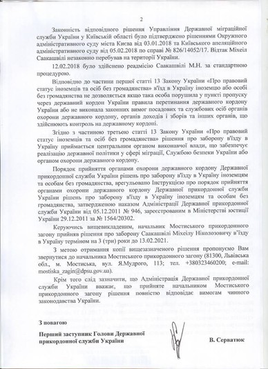 У відповіді першого заступника глави Державної прикордонної служби Василя Серватюка на запит адвокатів Саакашвілі, який надав агентству «Інтерфакс-Україна» захисник політика Руслан Чорнолуцький, зазначено, що Адміністрація Держприкордонслужби вважає, що дане рішення повністю відповідає вимогам чинного законодавства України.