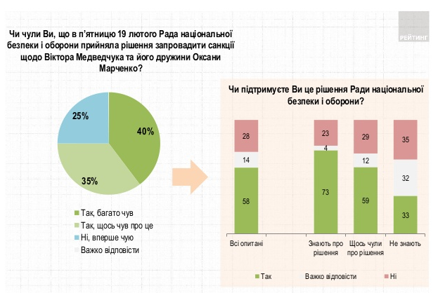 В Україні 75% громадян знають про рішення Ради національної безпеки і оборони щодо запровадження санкцій проти Віктора Медведчука та його дружини Оксани Марченко (40% добре знають, 35% – щось чули, водночас, 25% – вперше чують). Про це свідчать дані опитування Соціологічної групи «Рейтинг».