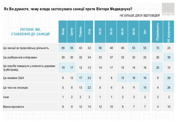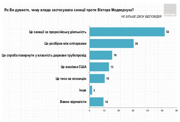 За даними опитування, 52% респондентів вважають, що введення санкцій проти Медведчука викликано його проросійської діяльністю, 30% – вважають це розбірками між олігархами, 16 % стверджують, що це спроба повернути у власність держави трубопровід, 13% вважають це вказівками із боку США, 10% говорять про тиск на опозицію.