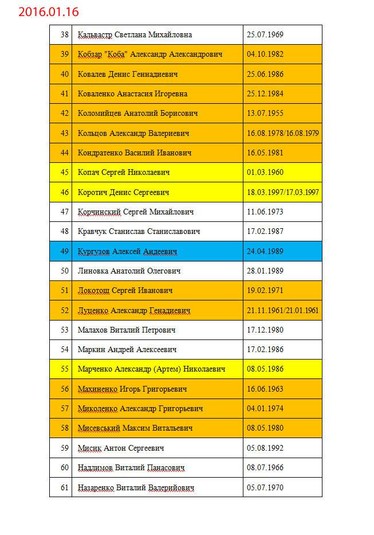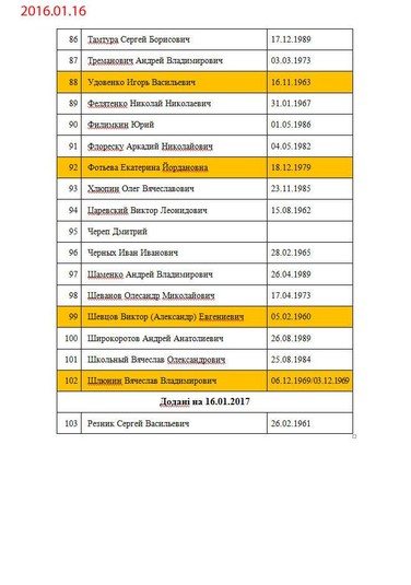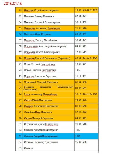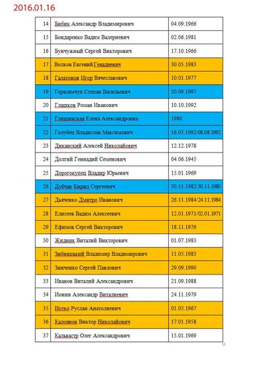 «Списки росіян, кадрових військових РФ... особи, що мають російське громадянство, але уродженці України, або українці, які втекли в Росію за програмою «Переселение соотечественников» та хотіли отримати російське громадянство, що утримуються в Україні СІЗО. Відкориговані станом на 16 січня 2017 р. Помаранчевий колір – ті, кого запитує «ДНР». Жовтий колір – ті, кого запитує «ЛНР». Блакитний колір – звільнені. Червоний колір – загиблі», – пояснила вона.