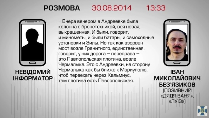 Служба безпеки України на офіційному каналі YouTube оприлюднила телефонні розмови полковника ЗСУ Івана Без’язикова щодо його співпраці з бойовиками, підконтрольними спецслужбам РФ.