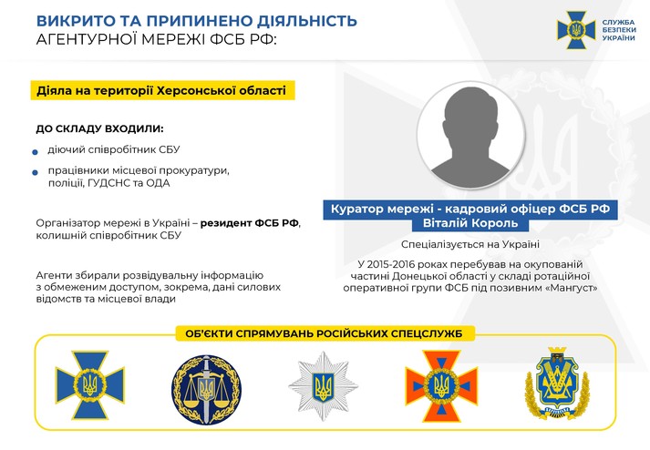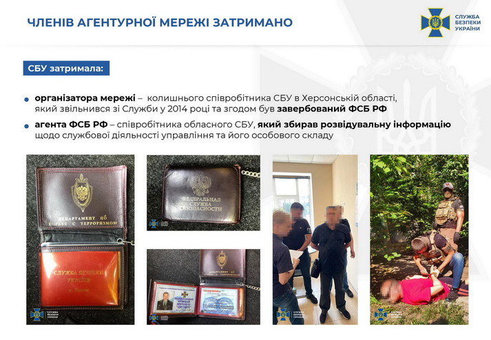 Служба безпеки України спільно з контрозвідкою та внутрішньою безпекою блокувала діяльність агентурної мережі ФСБ Росії, яка діяла на території Херсонської області. Про це повідомляє пресслужба СБУ.