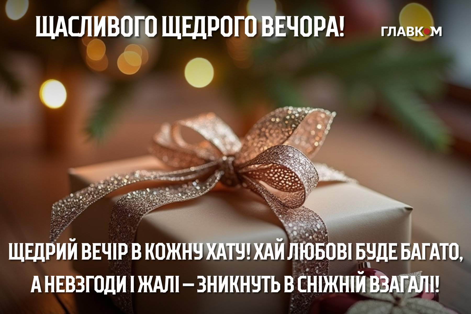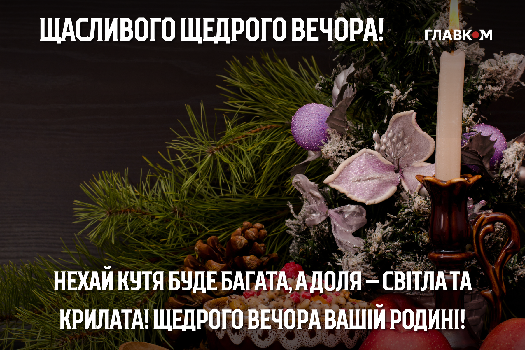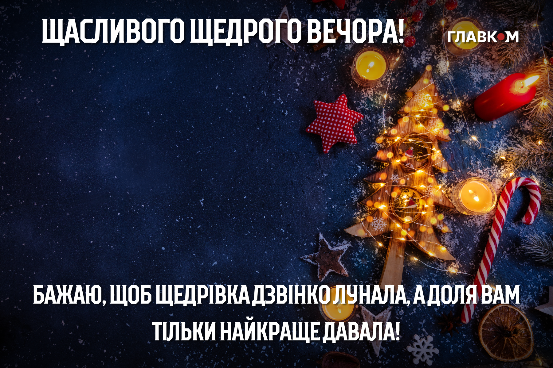Щасливих свят! Щасливого Щедрого вечора! Божої благодаті та миру, успіхів та щастя вашій родині! У цей вечір заведено зичити щедрості, тож я бажаю щедрості вашому серцю, щедрості вашому дому та щедрості з боку долі! Нехай вас оминають негаразди, а добробут панує.