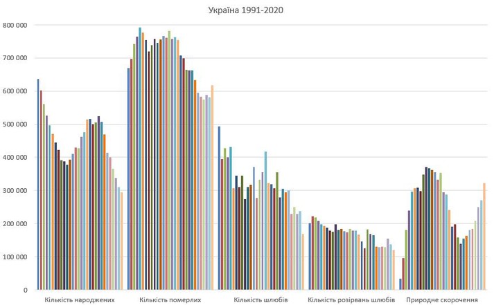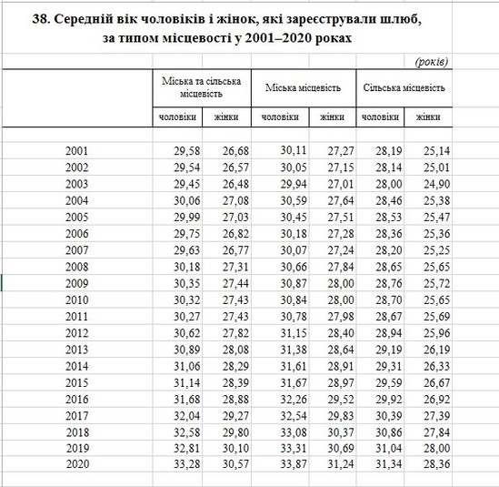 «Кількість шлюбів різко впала, так в 2015-2019 полягало в рік 230-250 тис шлюбів, а в 2020 всього уклали 168 тис шлюбів. Падіння порівняно з п’ятьма попередніми роками на 30%», – уточнив аналітик, підтвердивши інформацію відповідними графіками.