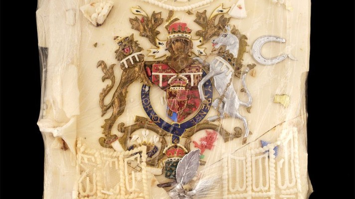 Шматок був вирізаний із одного з 23 офіційних весільних тортів. Він вкритий глазур’ю із зображенням королівського герба у золотистому, червоному, синьому та сріблястому кольорах.