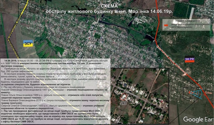 У п’ятницю, 14 червня, близько 5 ранку, збройні формування Російської Федерації з напрямку населеного пункту Олександрівка здійснили обстріл міста Марʼїнка, застосувавши ствольну артилерію калібру 122 мм, зокрема два осколково-фугасних снаряди. Внаслідок влучання двох снарядів суттєво пошкоджено житловий будинок, який, за оцінкою спеціалістів, відновленню будова не підлягає.