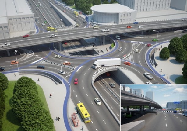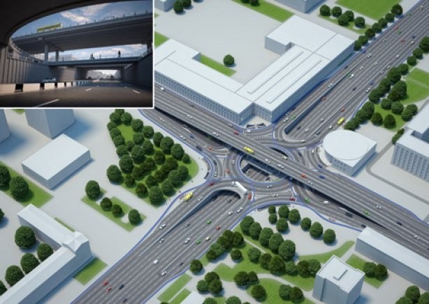 Передбачалось, що нова розв'язка буде трирівневою з реверсивним розподільним кільцем, і вона би включала велодоріжки та простір для піших прогулянок.