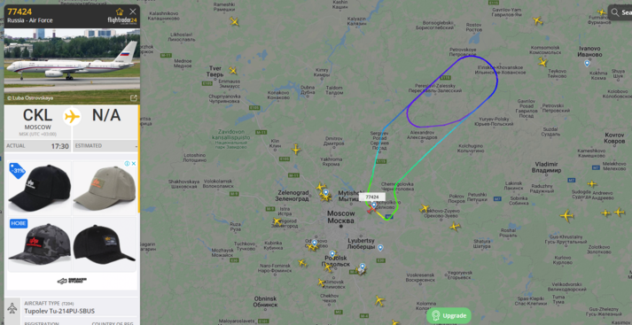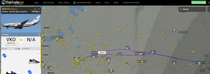 Сім різних літаків, що належать уряду Росії, здійснили сьогодні, 14 квітня, вильоти з Москви. Про це свідчать дані сервісу з відстеження авіарейсів.