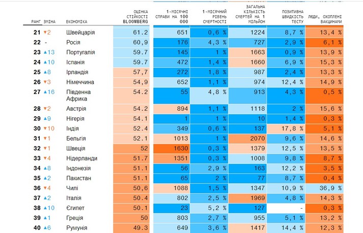 У рейтинг входять 53 країни, найбільші у світі за розміром економіки – України серед них немає. Bloomberg аналізує їхню ситуацію із коронавірусом за 10 параметрамами, включно з рівнем захворюваності та смертності, темпами тестування і вакцинації, а також свободою пересування.