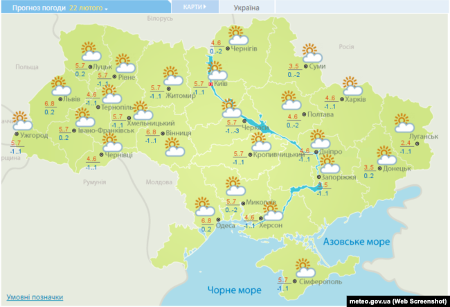 У суботу, 22 лютого, на всій території України буде мінлива хмарність, свідчать дані на сайті Укргідрометцентру.