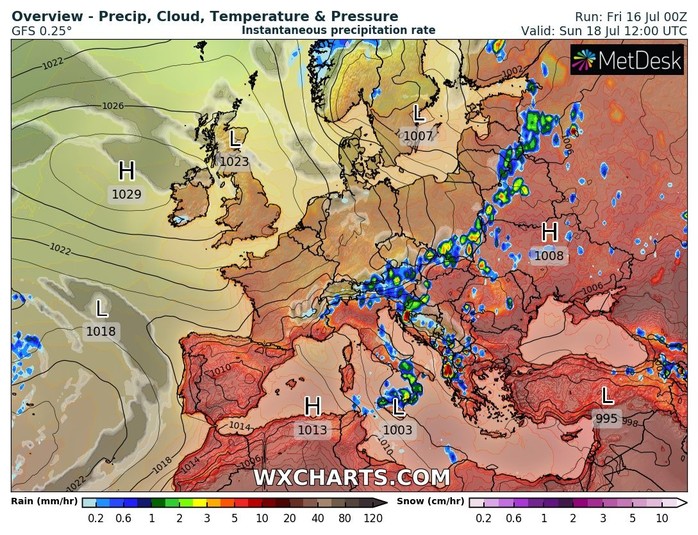 «Десь вночі, десь вранці, малими ділянками, проте ця зміна вже почалася. Не забувайте, що при таких потужних контрастах можливі короткі, але сильні й небезпечні зливи. На наступному тижні дощів явно побільшає. Спека 17-18 липня втримується: протягом дня в більшості областей України +30+35 градусів», – уточнила Діденко.