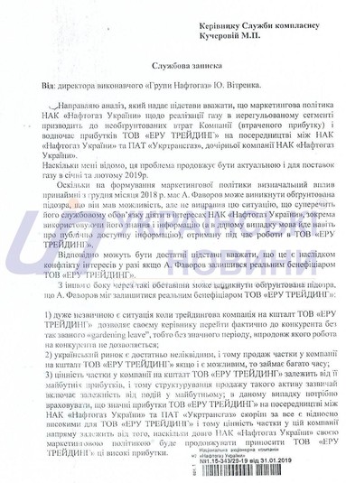«Все вище наведене дає підставу вважати, що Компанія не в змозі управляти таким конфліктом інтересів, який відповідно може призвести до значних необґрунтованих фінансових втрат», - йдеться в службовій записці Вітренка від 18 лютого 2019 року.