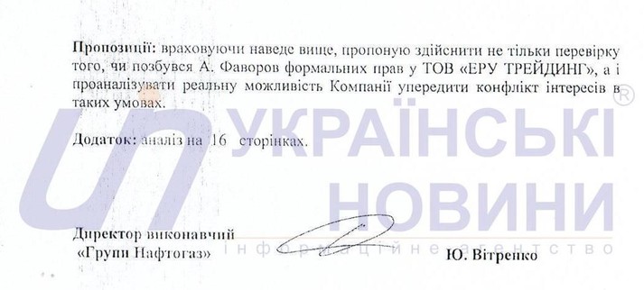 «Оскільки на формування маркетингової політики визначальний вплив з грудня 2018 року має А. Фаворов, може виникнути обґрунтована підозра, що він мав можливість, але не виправив цю ситуацію, що суперечить його службовим обов'язкам діяти в інтересах НАК «Нафтогаз України», зокрема використовуючи його знання і інформацію (в даному випадку мова йде навіть про публічно доступну інформацію) отриману під час роботи в ТОВ «ЕРУ Трейлдінг». Відповідно, може бути достатньо підстав вважати, що це є наслідком конфлікту інтересів у разі, якщо А. Фаворов залишився реальним бенефіціаром ТОВ «ЕРУ Трейдинг». З іншого боку, виходячи з таких обставин може виникнути обґрунтована підозра, що А. Фаворов міг залишитися реальним бенефіціаром ТОВ «ЕРУ Трейдинг». - зазначає Вітренко.