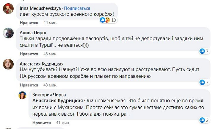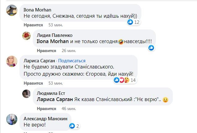 Коментарі до цієї посади Єгорова закрила, але запис уже «гуляє» по соцмережах, і українці, до яких звертається колишня телеведуча, пишуть у коментарях, що не вірять у щирість її каяття. Мовляв, найімовірніше, справа у документах дітей. Та й зазвичай, як і всім іншим зрадникам, Сніжани запропонували наслідувати курс російського корабля.