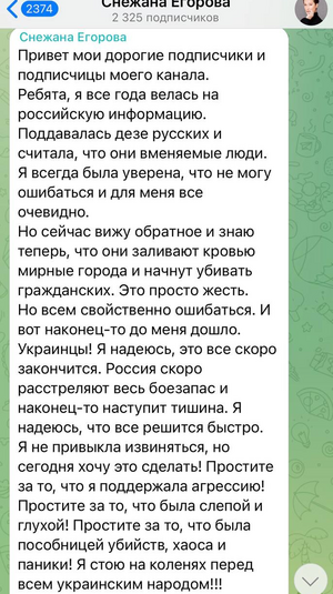 «Привіт мої дорогі передплатники та передплатниці мого каналу, – пише Єгорова у своєму телеграм-каналі. - Хлопці, я весь рік велася на російську інформацію. Піддавалася дезе росіян і вважала, що вони осудні люди. Я завжди була впевнена, що не можу помилятися, і для мене все очевидно. Але зараз бачу протилежне і знаю тепер, що вони заливають кров'ю мирні міста та почнуть вбивати цивільних. Це просто жерсть. Але всім властиво помилятися. І ось нарешті до мене дійшло.
