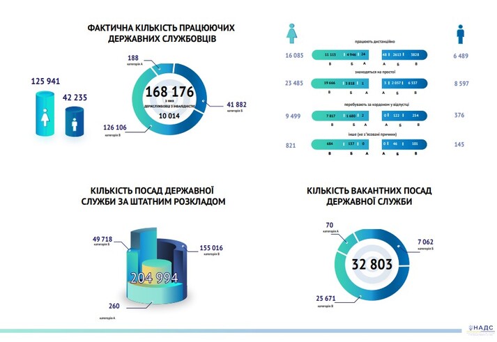 За чотири місяці фактична чисельність державної служби України скоротилася на 3,3 тисяч працівників і надалі зменшується. З урахуванням осіб, які знаходяться у відпустці для догляду за дитиною та частини мобілізованих держслужбовців цей показник, за даними, наявними в НАДС, сягає 5971 осіб. Переважна більшість цих людей звільнилися із початком війни.