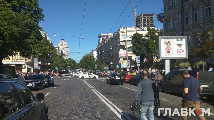 На місці події, що сталася на перехресті вулиць І. Франка та Б. Хмельницького, працюють керівництво столичної поліції та слідчо-оперативні групи Головного та районного управлінь поліції. Правоохоронці встановлюють свідків та очевидців цієї події, з’ясовують усі обставини скоєного.