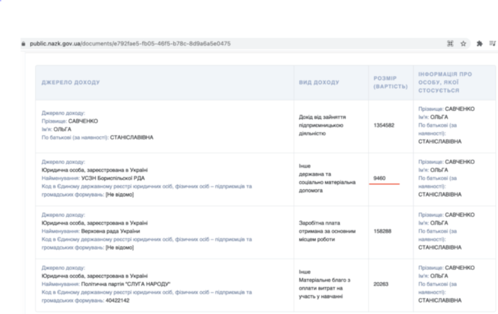 Згідно з даними декларації нардепки за 2019 рік, Ольга Савченко отримала 9600 грн соціальної допомоги